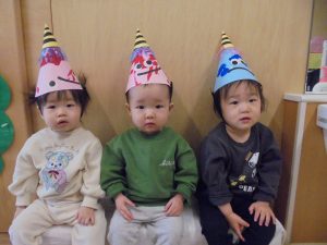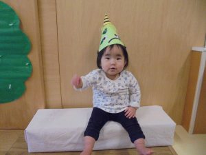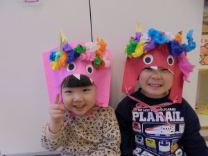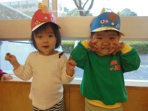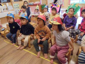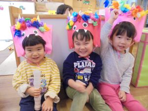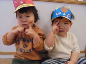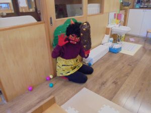 節分にちなんで作った鬼のお面を被って豆まきをしました。鬼のお面を被ると強くなると言って新聞紙の豆を怖い鬼に一生懸命投げましたよ。頑張りました!