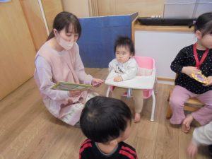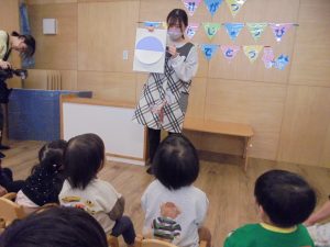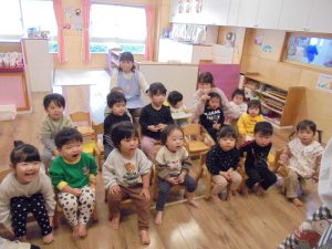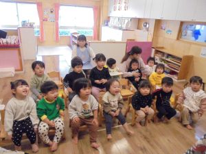 11月生まれのお誕生会をしました。誕生児のお友だちは4名(ひよこ組1名、うさぎ組1名、ぱんだ組2名)でした。お誕生の歌や季節の歌をうたってお祝いをしました。催し物のガチャガチャシアターはガチャガチャから出てくる大好きな物に大喜びの子ども達でした!