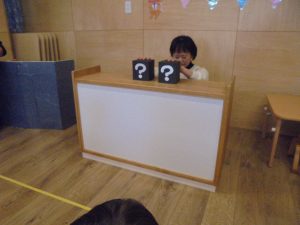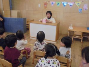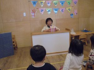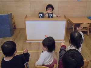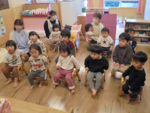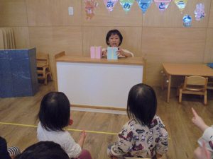 2月生まれのお友だちがいなかったのですが保育士2名はお誕生月でした!今月はお楽しみ会をしました。保育士がする不思議なプレゼントBOX」の催し物に目を輝かせていました。質問にもしっかり答えていましたよ。